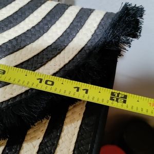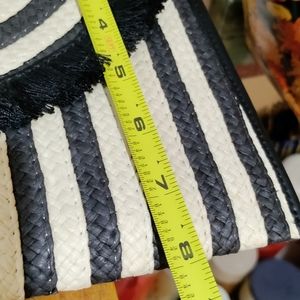 Stylish clutch with black and cream stripes. Features a unique woven design. Perfect for any occasion.
