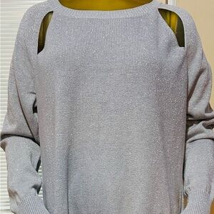 Chic gray sweater with scoop neck and cold shoulder. 55% Cotton, 23% Arcrylic, 14% polyester and 8% metallique.