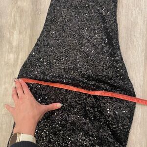 Dazzle in this black sequins dress. Features high-low hem and a super low back. I bought it in M (I am usually a size 4) but then had it taken in a bit. I included the measurements of the chest and waist but honestly it fits quite loose and just kind of hangs off the neck lol. I think it would fit many sizes.