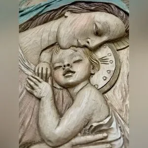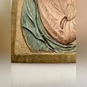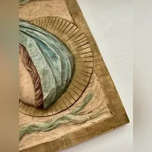 Vintage Bertagna Madonna wood carving depicting Mary and baby Jesus. Hand painted resin. Made in Italy. Absolutely stunning piece in beautiful condition. Perfect for home decor or as a thoughtful gift. 18 inches by 13 inches. Wall hanging on back.