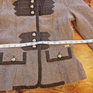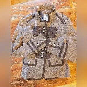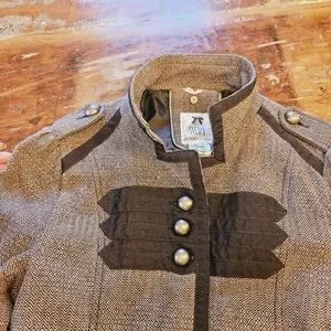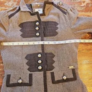 Elevate your style with this Miu Miu inspired black and grey military blazer, featuring metallic accents. Perfect for a sophisticated look.