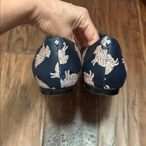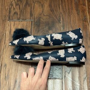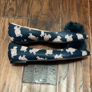 Sam Edelman Raddie Faux Fur Pom Pom Sheep Print Pointy Toe Flats size 9.5. There is a chip on the end of one point, but otherwise in excellent used condition and from a smoke-free home.