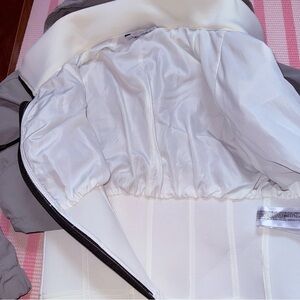 Stylish greenish jacket with cream accents. Features a hood and zip closure. Perfect for casual outings.