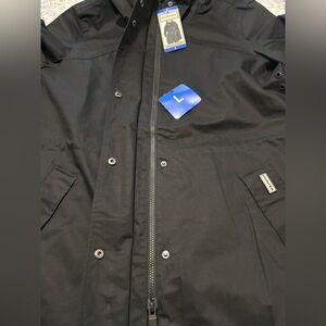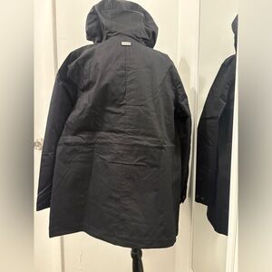 Stylish black utility jacket by Hunter. Features a practical hood and sleek design. Ideal for versatile wear.