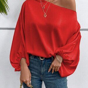 Red Orange Casual Women's One Shoulder Lantern Sleeve Blouse