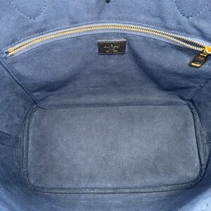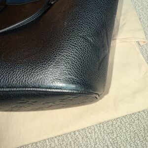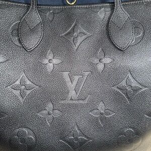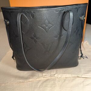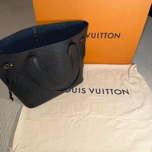 Black Louis Vuitton MM Neverfull with navy suede inside. Box, dust bag and shopping bag included. Slight wear on straps and on corner (shown in pics).