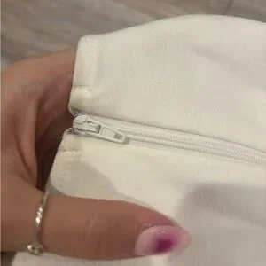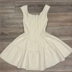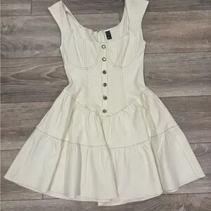 Chic cream mini dress with button-front detail. Sleeveless design with a flared skirt. Perfect for stylish outings. Small stain in the center, because of this I am very willing to negotiate price