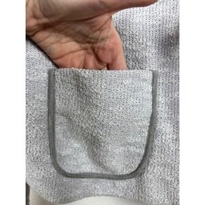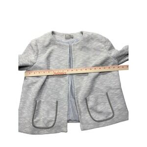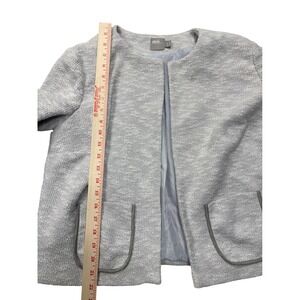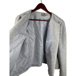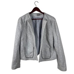 A stylish ASOS cropped blazer jacket in a light grey textured knit fabric. This open-front jacket features two front pockets with a grey trim and a smooth grey lining. The collarless design offers a modern silhouette. It is in the size women's US 12 and is in excellent preowned condition with no flaws to note.