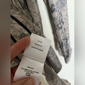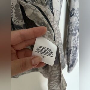 Tahari long-sleeve blouse with a grey and black paisley patchwork print