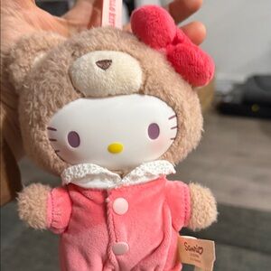 Features Hello Kitty dressed in a pink, bear-themed outfit.