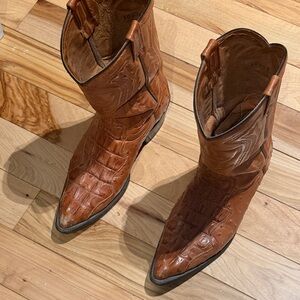 Vintage Stylish brown leather cowboy boots with intricate stitching. Ostrich and Croc leather Perfect for a western look.