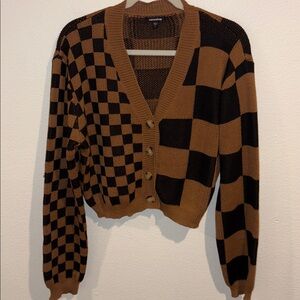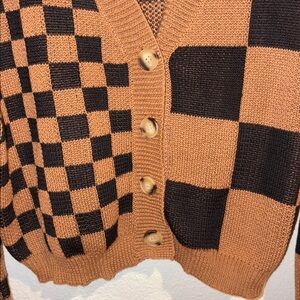 Stylish checkered sweater in brown and black. Perfect for a cozy and fashionable look.