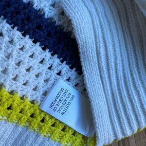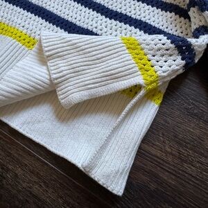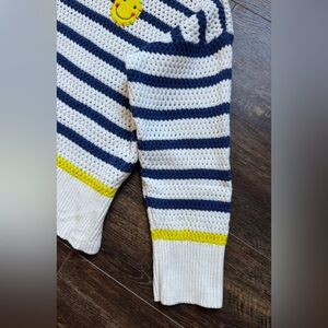 Make a happy statement with this XO by Kerri Rosenthal crochet knit sweater featuring the brand’s signature smiley face patch. Designed with navy and white stripes, playful yellow accents, and a cozy open-weave knit, this piece blends fun and luxury effortlessly.