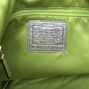The best part of this Coach Poppy is on the inside! The zippered top opens to reveal the most amazing, guaranteed to make you smile, lime green chartreuse satin lined interior with one inside zip pocket, and two multifunction slip pockets.