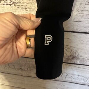 Classic black PINK by Victoria’s Secret yoga leggings with fold-over waistband and bold “PINK” logo detail down the leg. Signature “P” emblem at the ankle. Soft cotton blend with stretch for comfort and flexibility — perfect for lounging, workouts, or casual everyday wear.