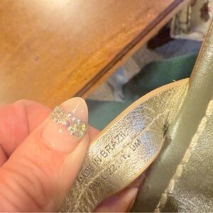 Signs of wear at shoe interior footbed metallic has faded, small scuffs on logo, minor scratches at toe see pics