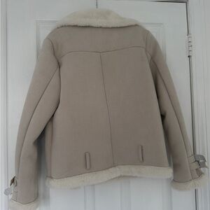 Warm and stylish beige faux-shearling aviator jacket.