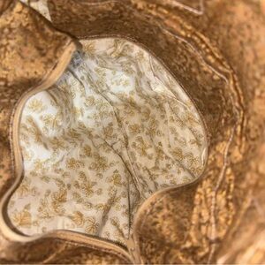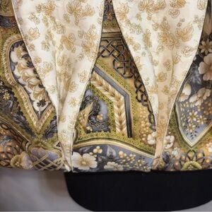 Stylish tote bag with a mix of gold, cream, and black patterns. Perfect for any occasion. Measures 20x12” Good preowned condition with no flaws.