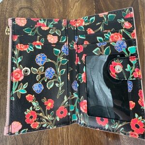 Chic and functional Kate Spade New York card wallet featuring a smooth pink leather exterior with a fun, colorful floral print interior. This slim design is perfect for carrying cards, ID, and essentials without bulk—ideal for small bags or everyday use.