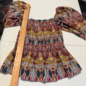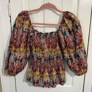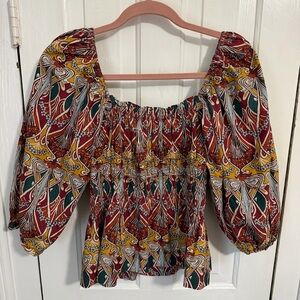 Square neckline. Three-quarter puff sleeves. Fit-and-flare peplum silhouette. Slipover style. Elastic cuffs. Unlined.