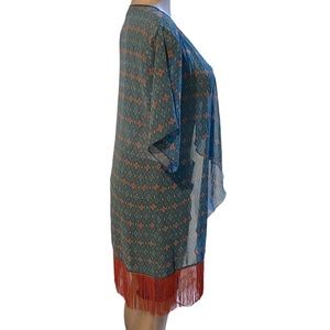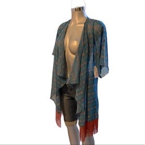 LulaRoe Lagenlook Duster Cardigan Fringe Sheer Kimono Blue/Red Western Sz Small