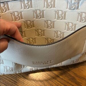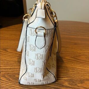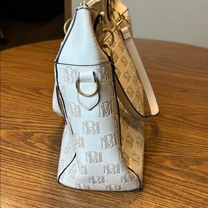 Large tote travel bag. Cream color vegan leather with monogram design. Gold hardware. Main zipper closure. Outside zipper pocket and pockets inside too. Stripe inner liner that is super clean! Some slight staining on bottom and one light stain on the trolley pass through. See last two photos.