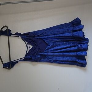 This stunning blue mini sundress from Lucy in the Sky is perfect for a cocktail night out. It features a sweetheart neckline with cap sleeves, offering a flattering and feminine silhouette. The dress cinches at the waist and flows into a playful, flared skirt, making it a standout piece for any evening event.