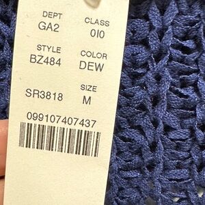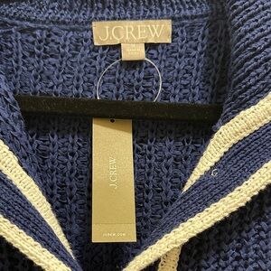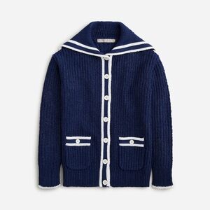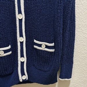 Chic navy cardigan with white accents. Features button front and sailor collar. Perfect for layering.