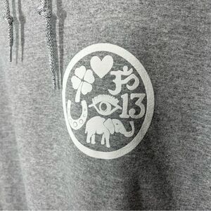 Jennifer Meyer Signature Good Luck Charm can now be worn by way of this soft gray hoodie sweatshirt. Adorned with seven symbols of good fortune - an elephant, evil eye, Ohm, horseshoe, four leaf clover, and a heart 0 luck has never been more cozy!