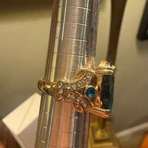 Elegant gold ring featuring a deep blue green gemstone. Ideal for special occasions.