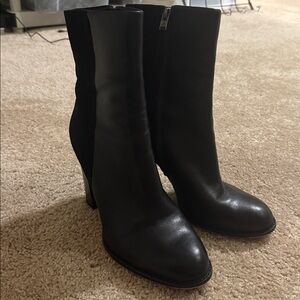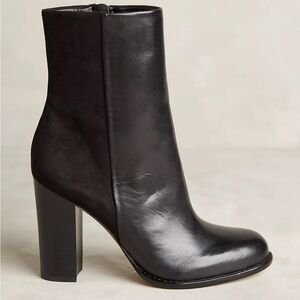 Sleek black leather ankle boots. Chunky heel. Side zipper closure.