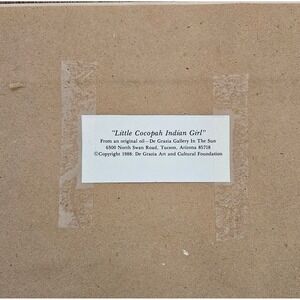 This framed print by artist DeGrazia features a portrait of a Native American girl in a Southwestern style, reflecting the artist's connection to the Navajo culture. Produced in Arizona, USA in the 1970s, the medium-sized artwork showcases intricate detail and vibrant colors typical of Indian and Southwestern themes. The framed print, measuring 23.5 inches in height and 19.5 inches in width, adds a touch of authenticity with its unique design and regional influence.