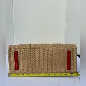 Elegant Marc Jacobs tote in brown with bold red handles. Features floral embroidery for a stylish touch.