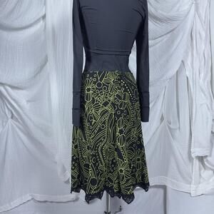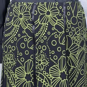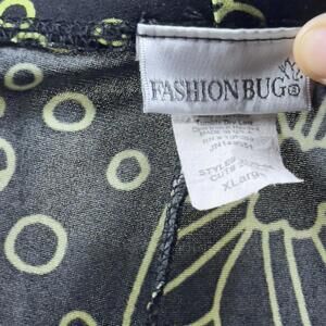 Black midi skirt with green floral and abstract patterns. Features a scalloped hemline with lace detailing. Size: Extra Large (XL). Brand: FASHION BUG. Condition: Very good pre-owned condition with no visible defects.