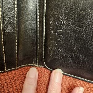 Classic/ Timeless Gucci. Tri fold wallet with inside zipper pocket, snap clasp, card and removable check book holder. 2 minor spots of wear as indicated in pictures. 7 1/2" long. 4"wide.