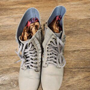 Elevate your edge with these stunning Betsey Johnson Litz-L combat boots! These aren't your average boots—they feature beautiful feminine ruffle detailing along the eyelets and a gorgeous dusty blue leather finish.