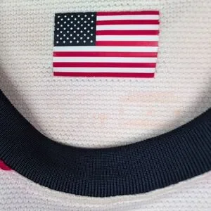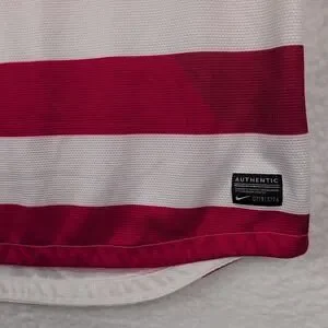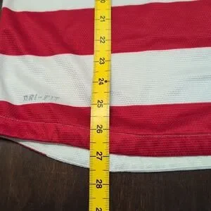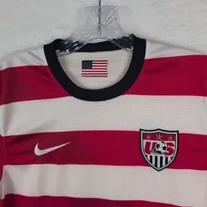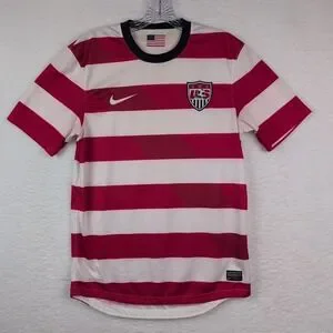 The product is a Nike USA National Team Soccer Shirt in size small, representing the USMNT. This officially licensed home jersey for men features the iconic red color with short sleeves, suitable for adult fans of soccer. Made in Thailand, this jersey is a great addition to any collection of national team apparel, perfect for supporters of the USA team looking to show their pride and passion for the sport.