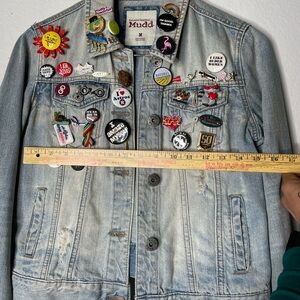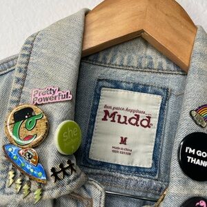 Chic Mudd denim jacket with vibrant pins. Adds flair to any look. Ideal for casual wear.