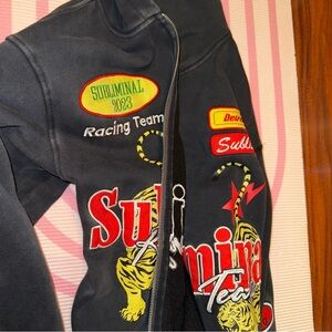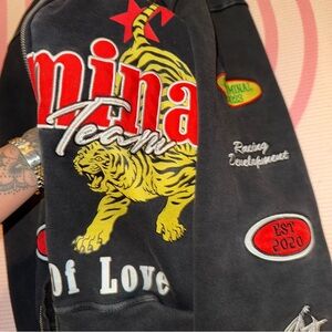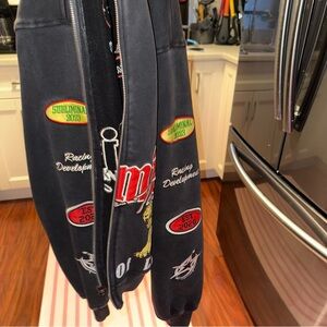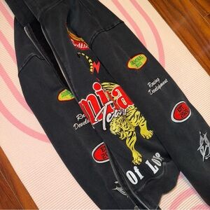 Stylish black sweater with bold graphic designs. Features vibrant red and yellow accents. Perfect for a trendy look. Worn one time only I did wear a fur coat that I posted so it might have a little hair I passed the lint roller and toook pretty much all of it but just incase I wanted to let ppl know also it’s like an acid wash color so not really dark black