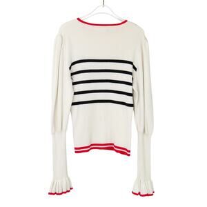 Embossed Cream Peplum Knit Sweater. Off White with Black and Red Stripes and Accents. Fitted Sweater. Super Cute Sweater.