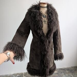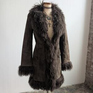 Vintage Brown Suede Penny Lane Jacket Fur Shag Leather Groovy Trench Coat Medium