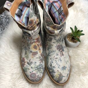 Dingo Women's Jackpot DI 132 bootie in off-white floral leather. It features a comfortable cushion insole, a slouchy shaft design, and a round toe.
