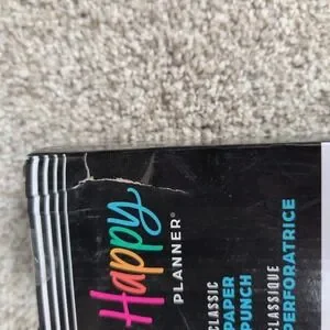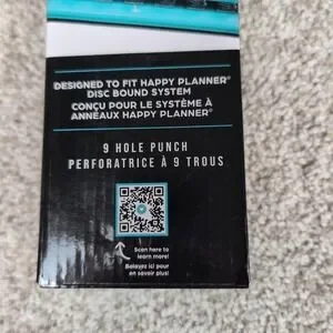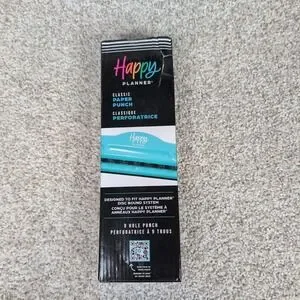 Classic Happy Planner paper punch in teal. Designed to fit the Happy Planner disc bound system. Punches 9 holes for standard Classic Happy Planner pages. Capable of punching 3 paper sheets or 1 cardstock sheet at a time. Not intended for use with plastic, adhesive, or laminated products.
