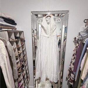 Camila Coelho white maxi dress with halter neckline. Features a flowing skirt and button accents.