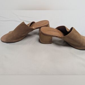 Size 8 Lucky Brand mules with wood grain heel. 100 percent leather upper.