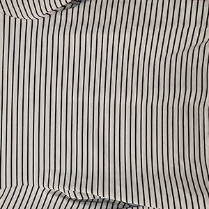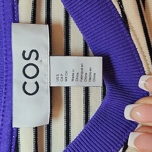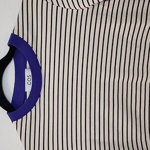 Elegant striped top by COS. Features cream and black stripes. Accented with a bold purple collar. Perfect for any occasion.