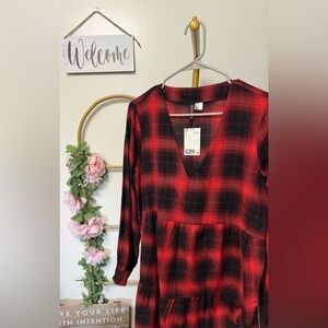 Short, A-line dress in cotton flannel with a deep V-neck and long, wide sleeves with narrow, buttoned cuffs. Gathered seams under the bust and at the hips for added width. Unlined.