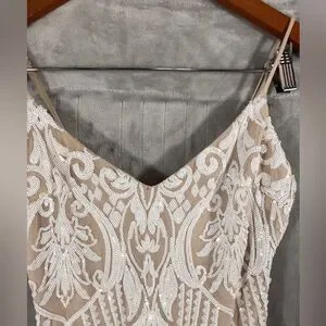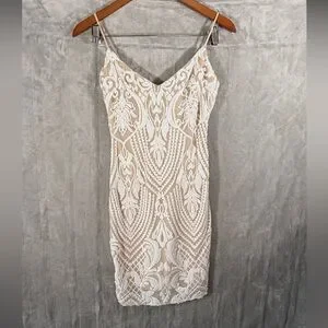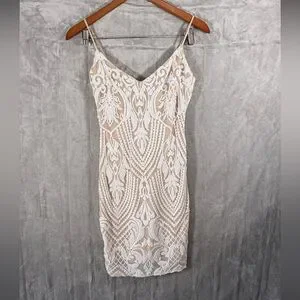 Stunning Windsor nude and white sequin bodycon mini dress in size Small. Features all-over embroidered sequin design, adjustable straps, and full stretch lining for comfort. Perfect for parties, homecoming, bachelorette events, New Year’s Eve, or any night out.