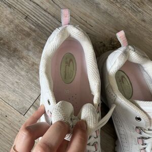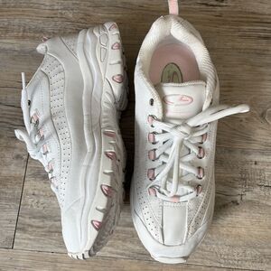 Y2K Champion Platform Sneakers in white and pink — women’s size 10. Vintage chunky trainers with classic 2000s style, featuring thick soles, retro detailing, and that perfect pop of pink. A must-have for Y2K lovers and vintage sneaker fans.
