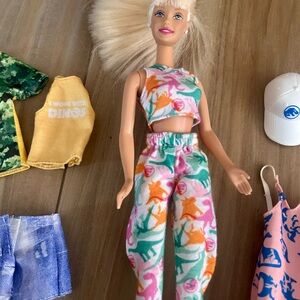 Barbie doll with Jurassic Park dinosaur print outfit. Includes additional clothing and accessories. Excellent condition.